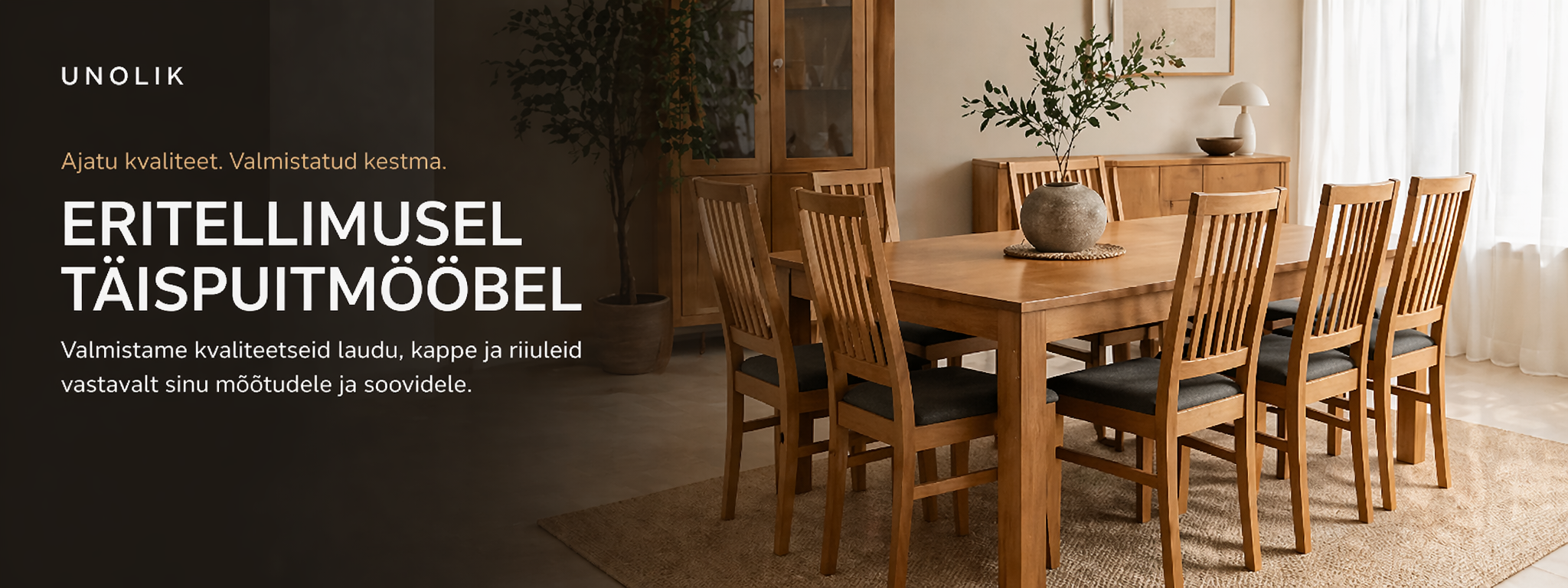 Iga Unoliki mööbliese sünnib hoolikalt valitud materjalidest. Täispuidu valikus on kask, tamm, saar ja must lepp, lisaks kase- ja tammespoon, et ühendada loomulik ilu, tugevus ja ajatu esteetika. Viimistluse ja toonide valik võimaldab luua lahenduse, mis sobitub harmooniliselt sinu kodu iseloomuga.